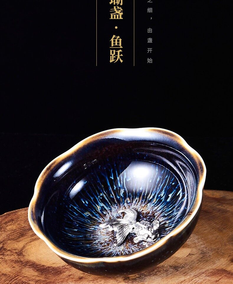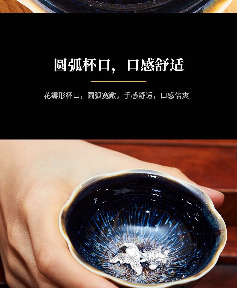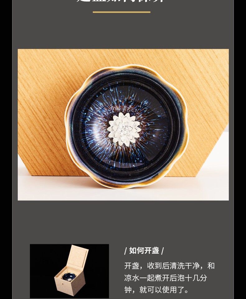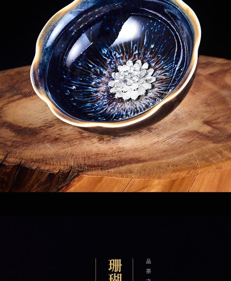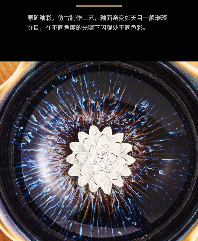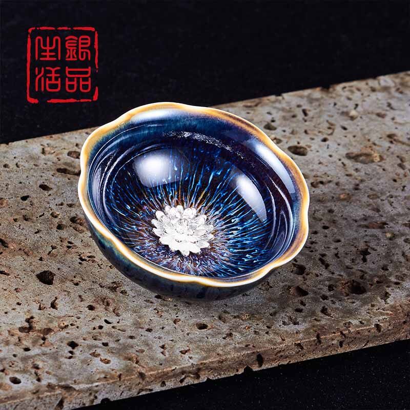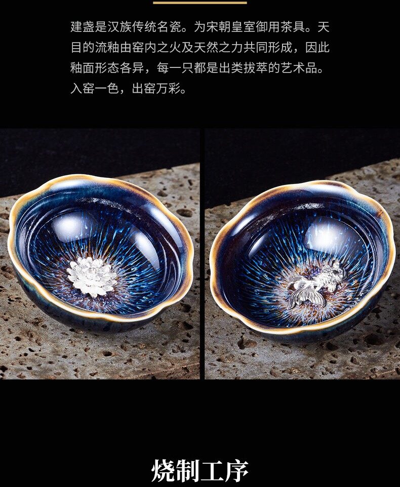 窑变天目釉建盏银茶杯陶瓷莲花功夫茶杯家用镶银主人杯