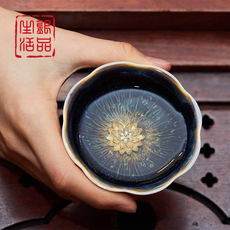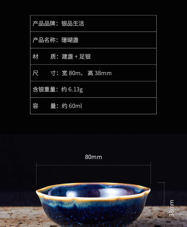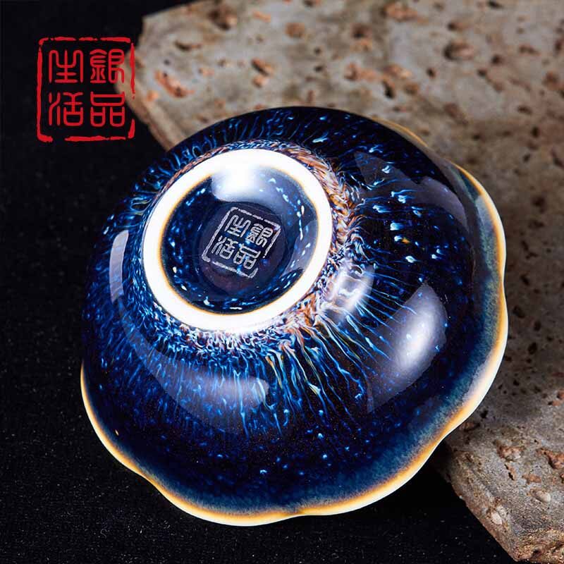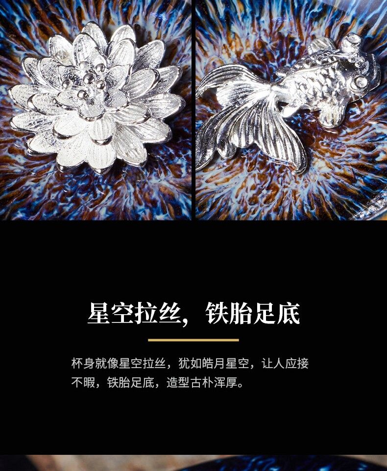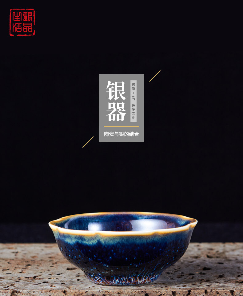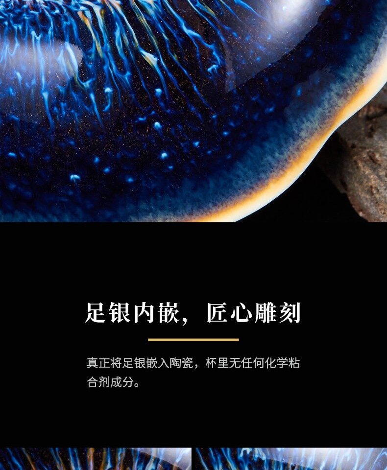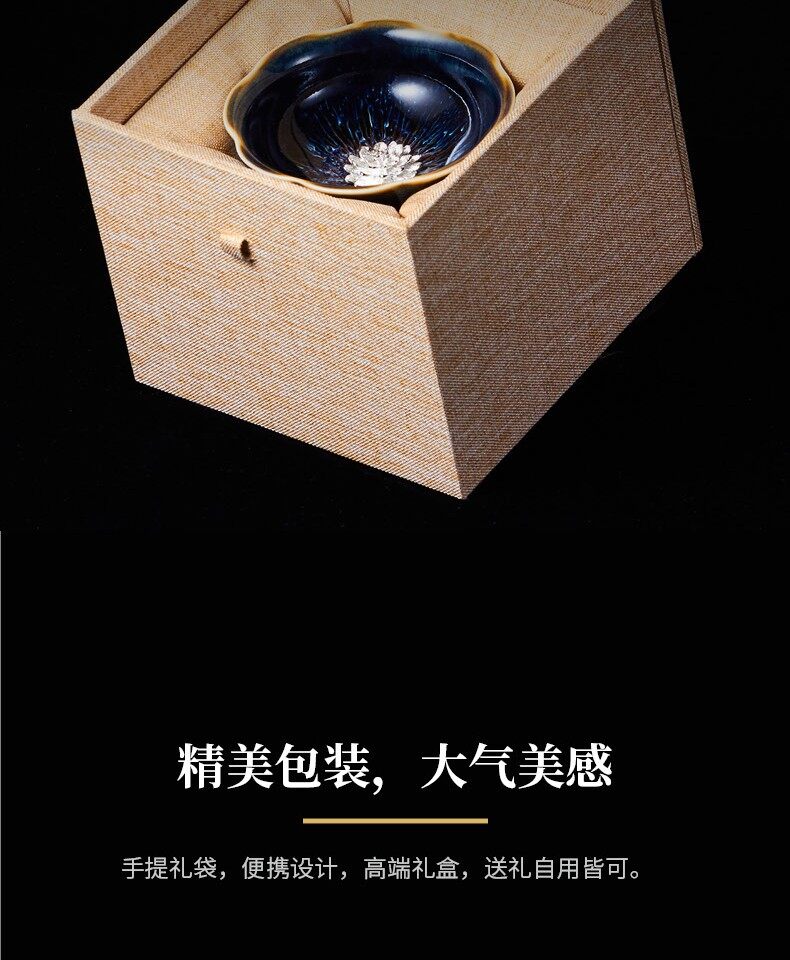 窑变天目釉建盏银茶杯陶瓷莲花功夫茶杯家用镶银主人杯