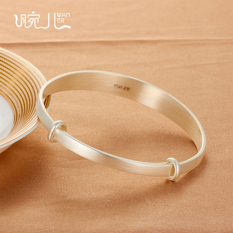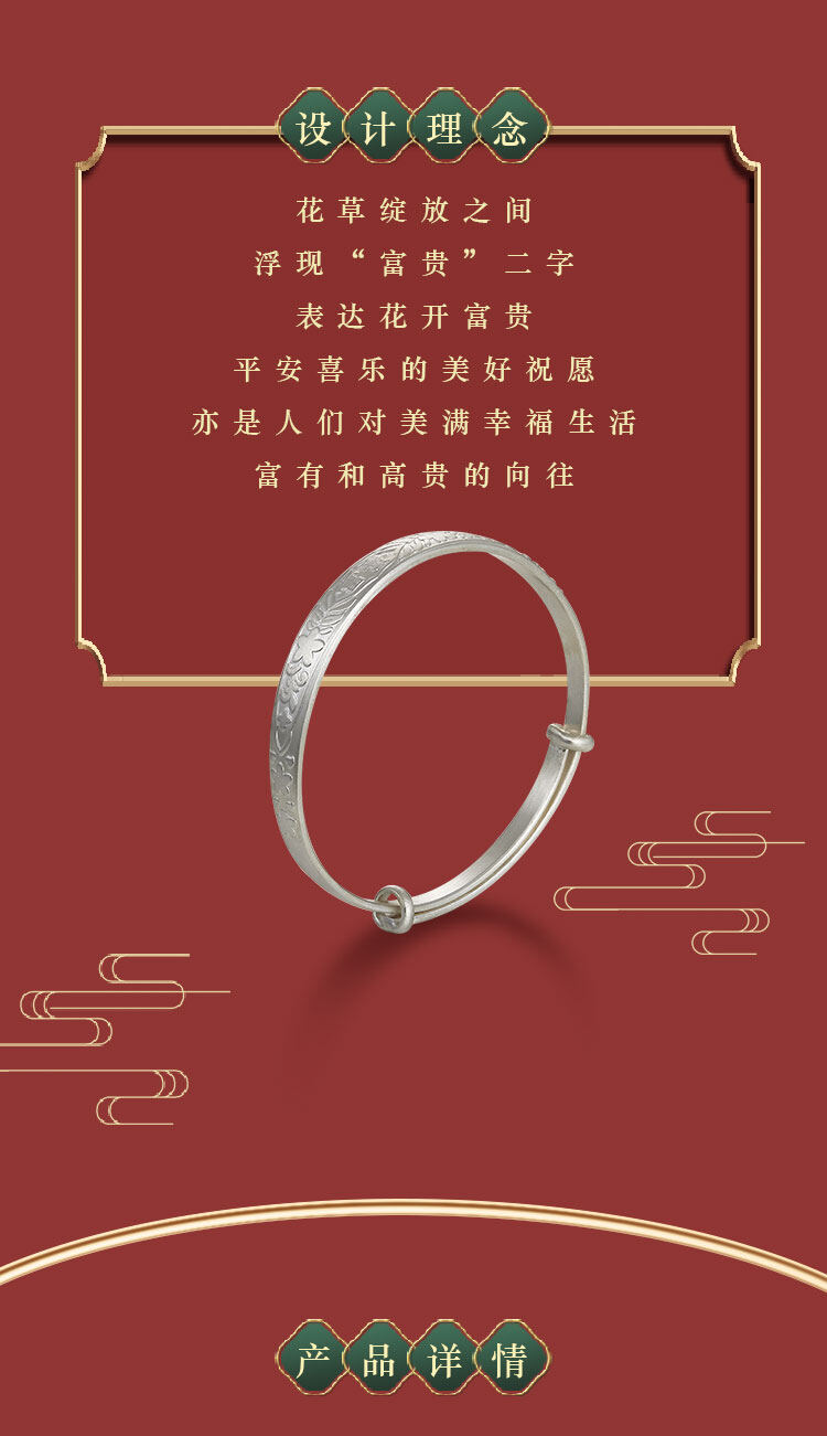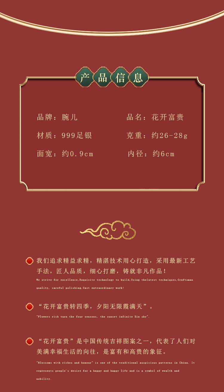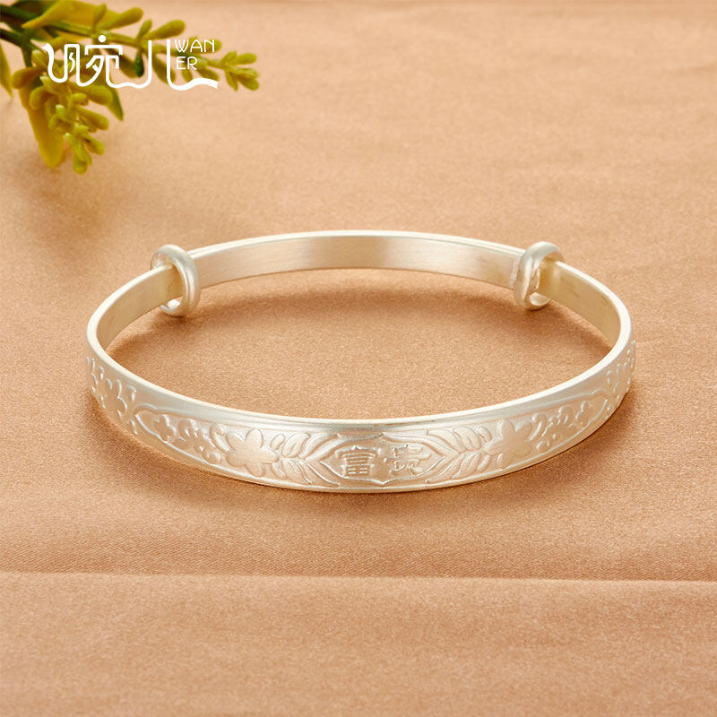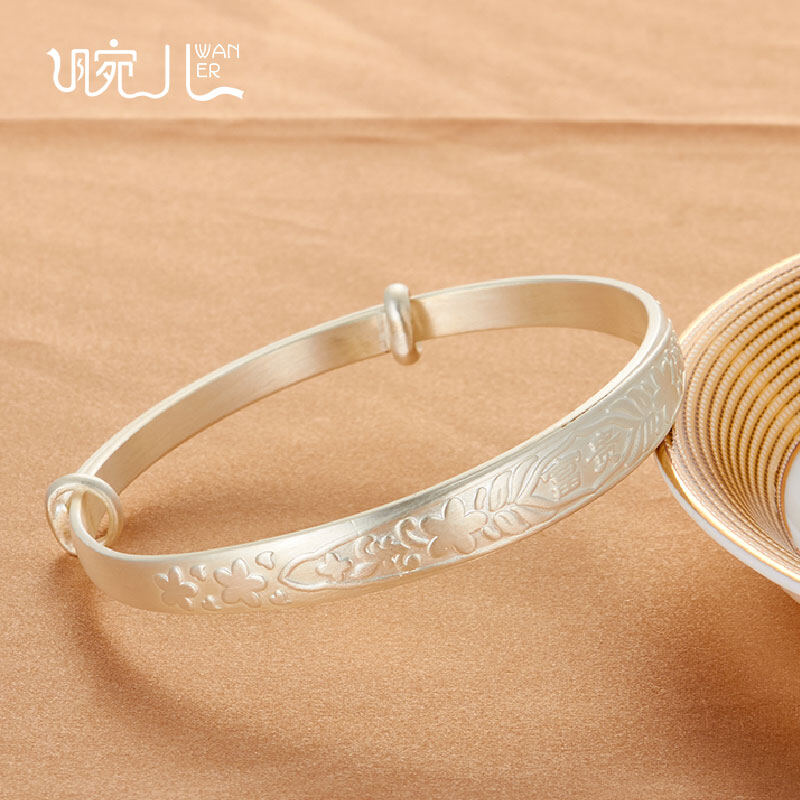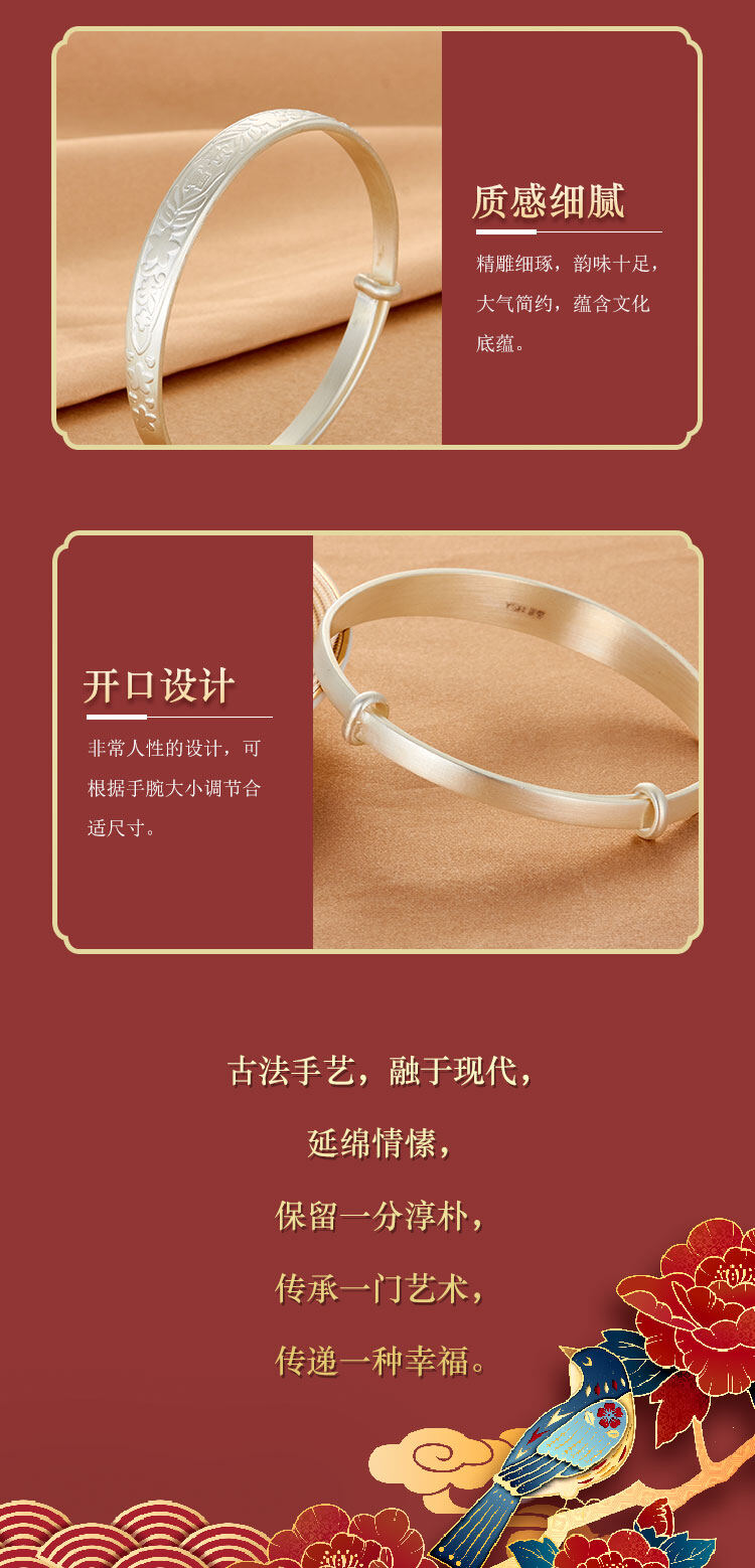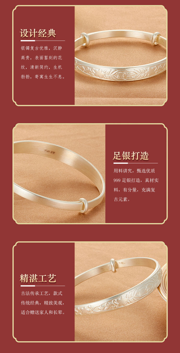 花开富贵9999纯银镯子复古优雅足银手镯女推拉可调