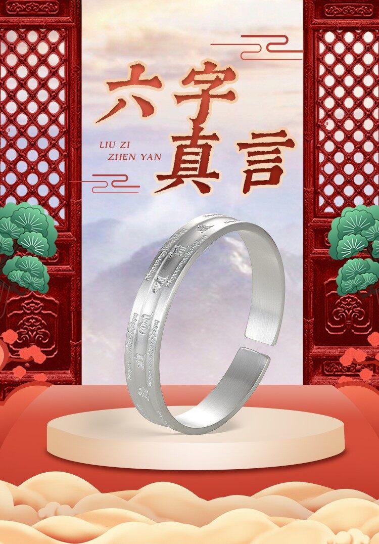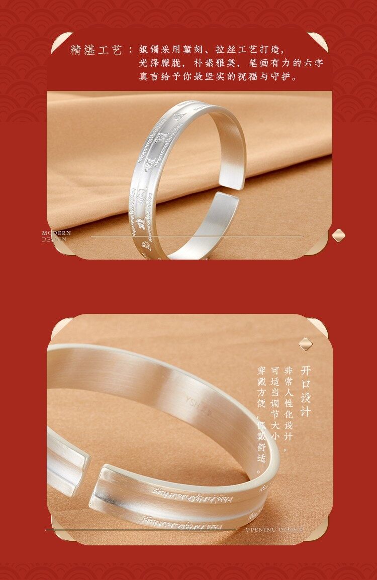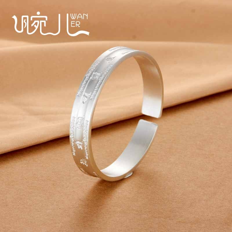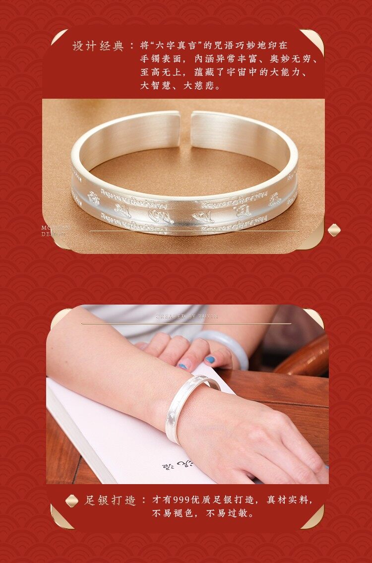 999足银六字真言光面实心加厚开口可调足银镯子经文手环刻字